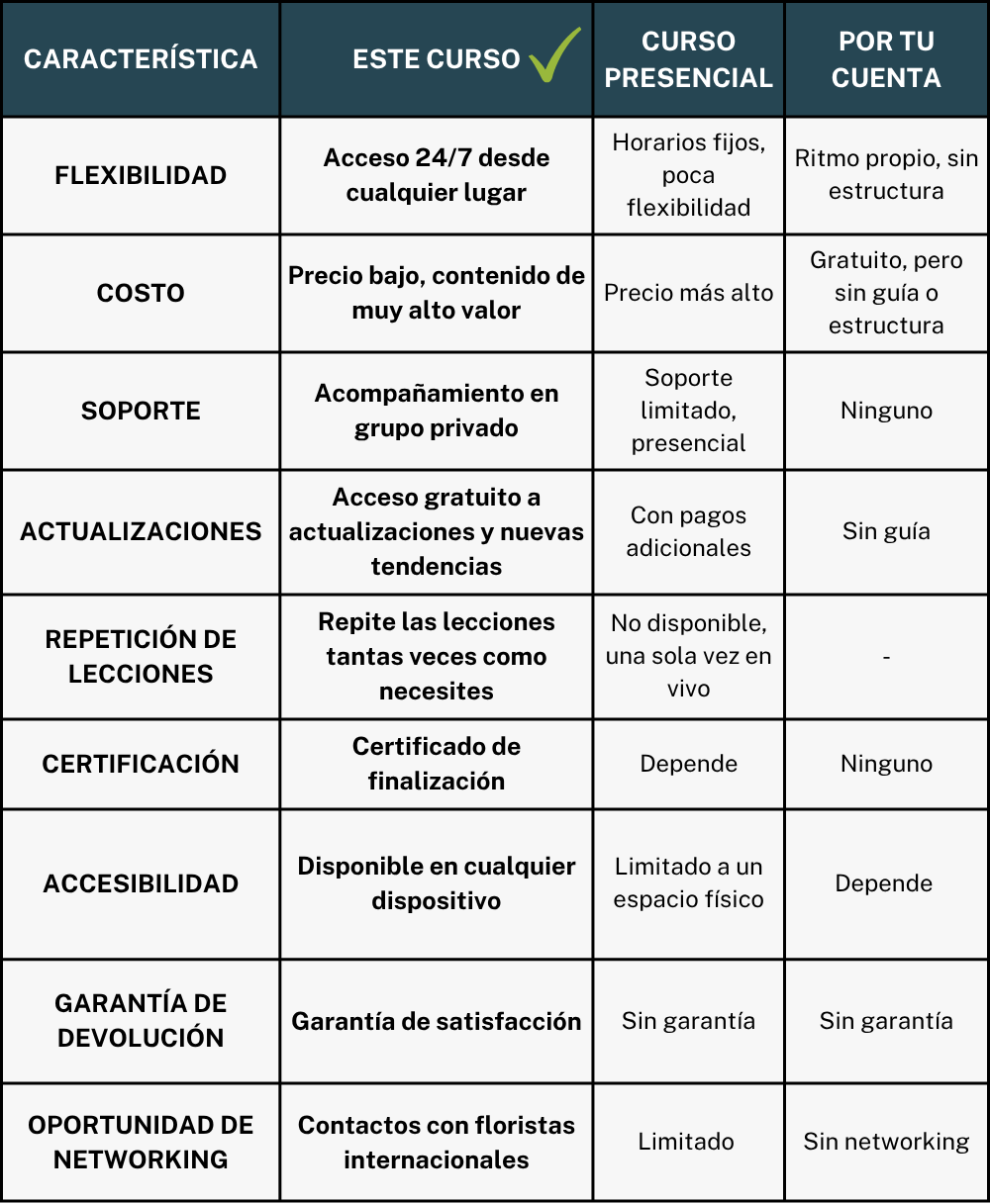 Tendrás acceso al curso durante 7 años completos, un período más que suficiente para verlo a tu ritmo, aplicar todo lo aprendido, resolver tus dudas y construir una florería rentable y exitosa. Además, al finalizar esos 7 años, si deseas seguir actualizándote con nuevas tendencias y contenido, tendrás una oferta especial para adquirir el curso actualizado.